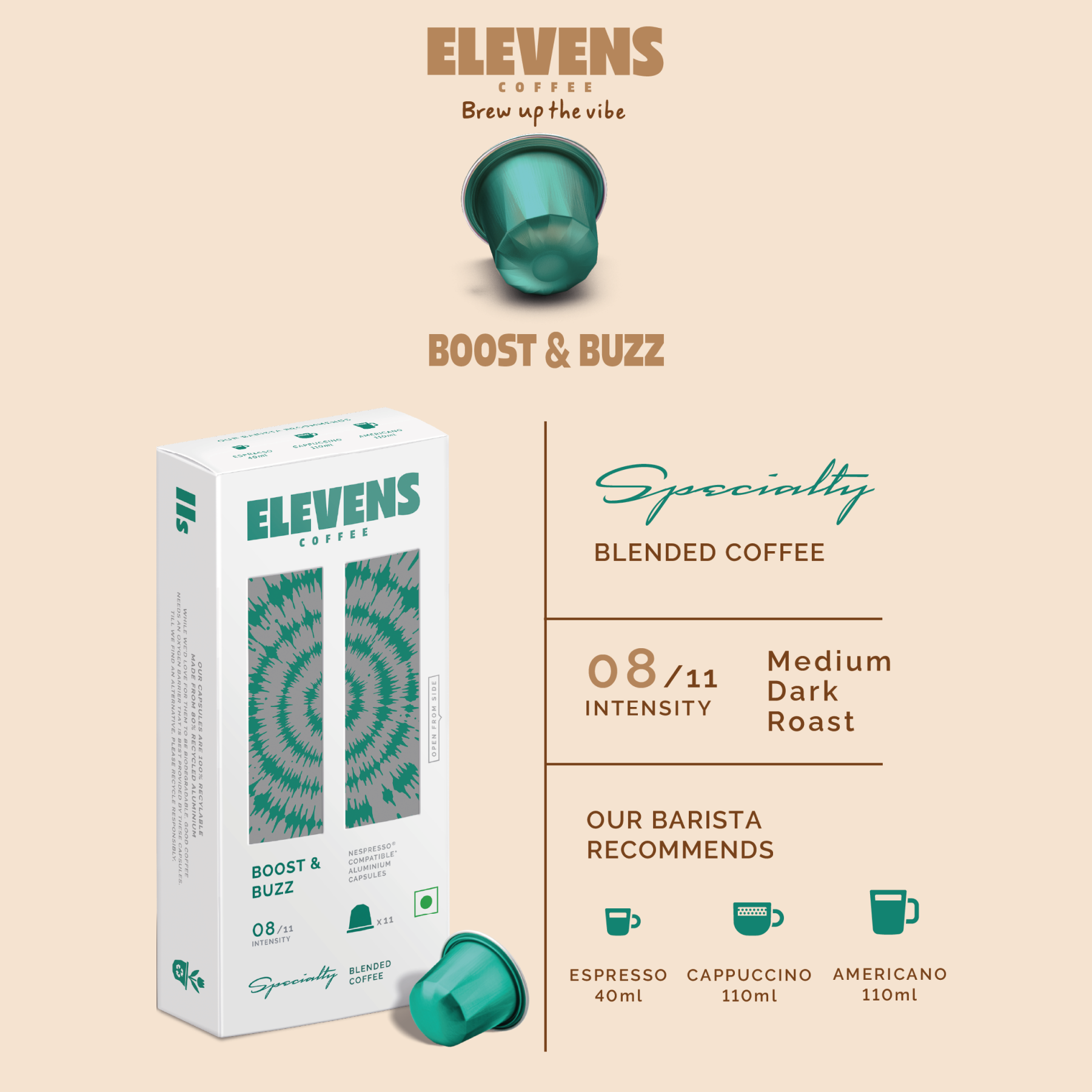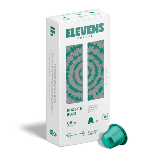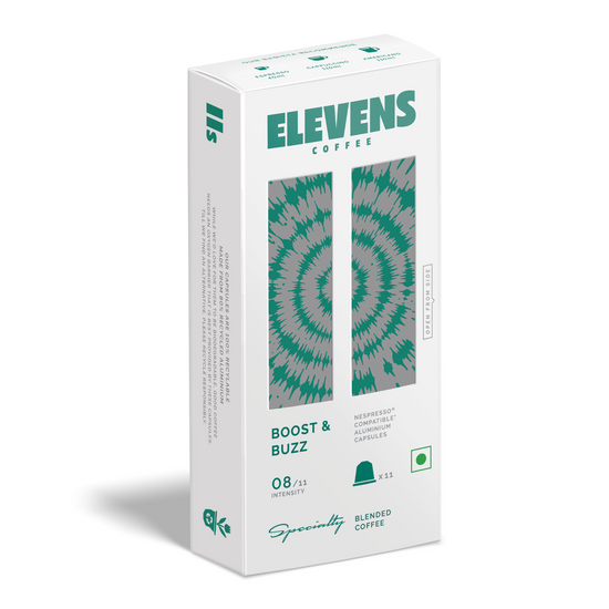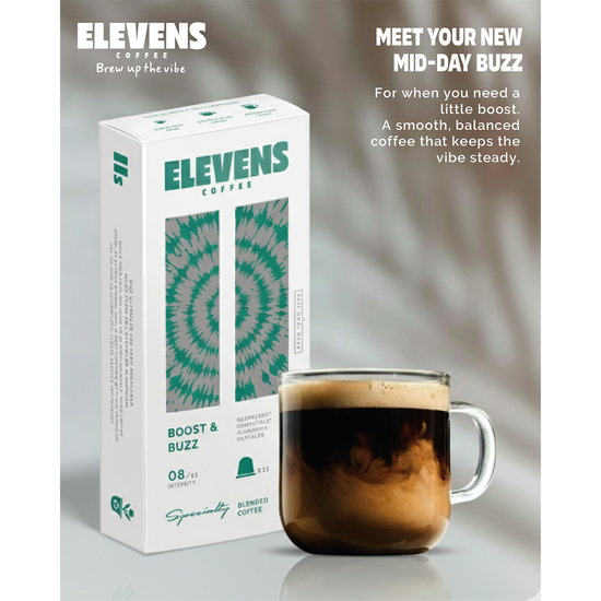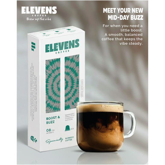 ELEVENS COFFEE | Boost & Buzz | Blend of Arabica & Robusta | Specialty Coffee Capsules | 11 Aluminium Coffee Pods (10 + 1) | Medium Dark Roast | Intensity 8 | Compatible with Nespresso